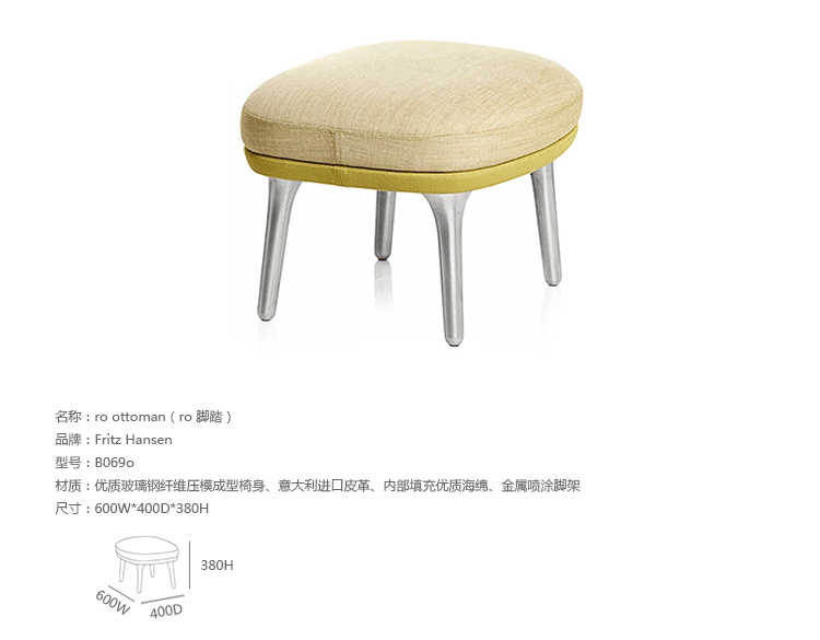 Ro 系列家具由Jaime Hayon所设计,他说:“我们投入了大量的努力在这把椅子上,并从人体形式上寻找灵感。我们想要一把椅子,是既舒适又美丽。我的目标是制作一个苗条、 优雅的椅子,激发条件反射和舒适感。”制作采用优质玻璃钢纤维压模成型椅身、意大利高级进口皮革、内部填充优质海绵、金属喷涂脚架。