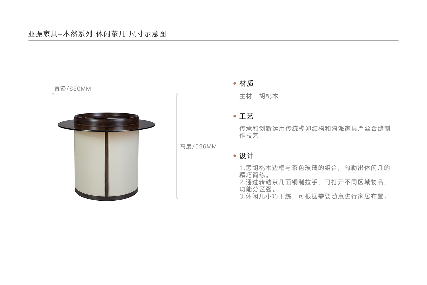 1.黑胡桃木边框与茶色玻璃的组合,勾勒出休闲几的精巧简练。 2.通过转动茶几面铜制拉手,可打开不同区域物品,功能分区强。 3.休闲几小巧干练,可根据需要随意进行家居布置。