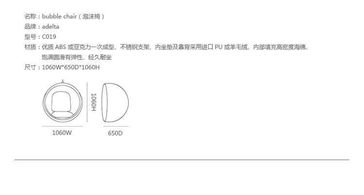 "芬兰家具设计大师艾洛.阿尼奥(Eero Aarnio)在德国品牌Adelta的代表作Bubble Chair(泡泡椅)。灵感来自于Ball Chair,但尺寸略小,而且椅子是以压克力制成,光线可以从四面八方透进。压克力加热充气,使它成为皂泡状,加入一个钢圈和椅垫即成。这样一组貌似轻巧的家具,但却能负重至少200公斤以上,由天花板垂链将Bubble吊起,宛如漂浮于空气中的泡泡一般!洁净面透明!带着科技感的椅子,又像置身于太空中,未来感十足。摆脱了椅子就是要放在地板上的刻板印象。最适合为摄影背景之用。坐在这把椅子上,即使身处一个拥挤的空间,也有点遗世独立的奇妙感觉。挪威一家电话公司在总公司入口大厅吊了几把这样的椅子,让客户可以在打行动电话时,有个宁静的空间。这件作品在1966年的科隆家具博览会上一举成名。