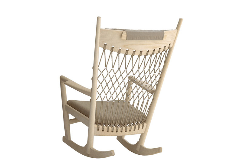 Rocking Chair(摇椅)是大师Hans J. Wegner设计的众多摇椅中的经典之作。摇椅具有简洁的线条,精准的的人体工学结构,是Hans J. Wegner在1944年为身怀六甲的妻子设计,扶手前端微微向外展开,是为让妻子方便起身。实木制成,轻便耐用,简约单纯,仍于潮流中立于不败之地,为Hans J. Wegner最受欢迎的经典作品之一。我们已经能从中感受到圈椅的影子。摇椅水曲柳制作,坐垫麻布软布(内部填充优质海绵),棉绳编织(有白色,黑色,棕红色可选)。