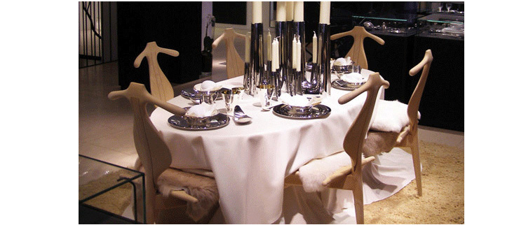 The Valet Chair(侍从椅),1953年设计,是Hans J. Wegner的经典代表作之一。这把椅子是Hans J. Wegner同建筑师 Steen Eiler Rasmussen 和设计师 Bo Bojesen 聊天谈到就寝时折叠衣服的麻烦,他就做了这个有趣的设计,为了让它看起来不笨重,从4条腿减到3条。靠背两侧选用对称的木纹,木纹的机理是整个靠背有机曲线的补充。椅子看起来像一把提琴,又像一个穿着燕尾服的侍从,不但具有美感,而且很具实用性。
