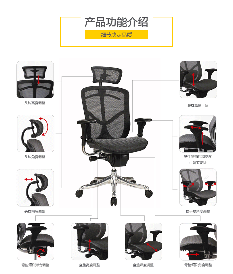 金尊的唯美设计有利于持久的舒适和美感。人性工学椅的结构和功能利用同步倾仰底盘控制功能锁定,滑座和高度调节。高度和角度均可调的扶手和头枕都包含在这张独一无二的工学椅里。