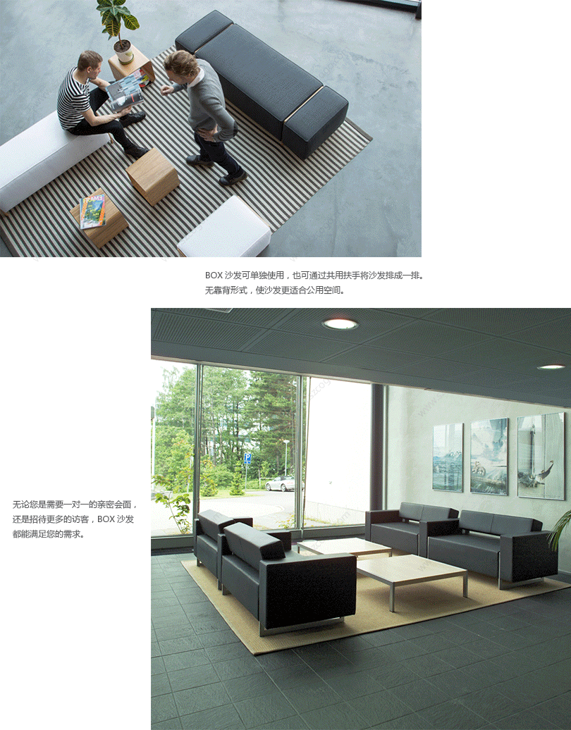 BOX沙发有标准的单人位、双人位、三人位沙发和休闲长凳组成。沙发的靠背可选配,扶手可共用。面料可选择布艺或皮革,为您的接待区打造独特的装饰效果。