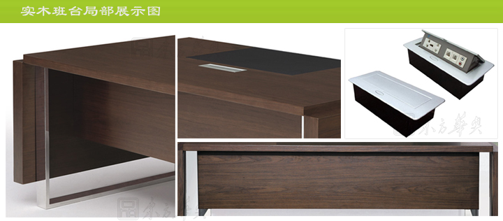 ※ 上图为此款班台的细节展示,以及班台的配置选择,仿皮写字板,手动线盒,线盒内部配置可根据需要选配:万能插口,网线口,麦克口,视频口等