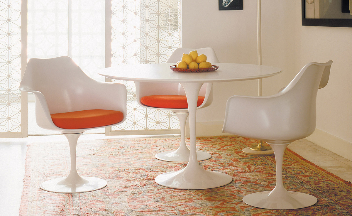 Tulip Dining Table(郁金香餐桌)是芬兰裔美国设计师Eero Saarinen在1956年设计的作品。优雅、清秀的桌脚配上天然的大理石桌面,极简却又完美。Tulip Dining Table(郁金香餐桌)是现代餐桌的代表作,作为家庭中使用餐桌、高档饭店中的餐桌和酒店中使用的餐桌都非常合适。作为著名家具设计师设计的作品设计品位自然不会低,这种餐桌设计出来的时候就被广泛的运用到了饭店、酒店和家庭中,成为当时最热销的餐桌之一,餐桌主要材料是玻璃钢(可选大理石),整张桌子是采用一次成型,中途不会出现裂缝,有质量保障,桌面平滑不会凹凸。