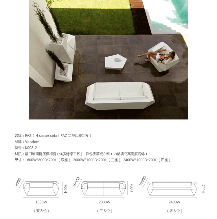 FAZ是西班牙著名建筑师Ramon Esteve为VONDOM公司设计的组合家具和花盆系列。Ramon Esteve是和谐的,平静的和永恒的建筑师,创造了一个矿物质的,表现力丰富的形状,;令FAZ跟我们的家或其他环境完美融合。气氛,包围的结果是材料和光线元素幸福的组合,其独特的察觉是气混合体。他们的灵魂,VONDOM,他的独家性是他原材料的品质,允许,甚至在最苛求的环境使用。FAZ的组合性允许消费者灵活的组合他们的家具和花盆,来适应他们的风格,但并没有失去这家具系列的和谐。FAZ,由辅助桌子,扶手椅子,组合沙发和咖啡桌子,还有三个不同比例的花盆组成。这个系列还配套了最优质的户外坐垫。FAZ,他的结果是表现本质,包含复杂性和密度性,直到极端细节的杰作,其目的是创造一个我们向往的居住地。