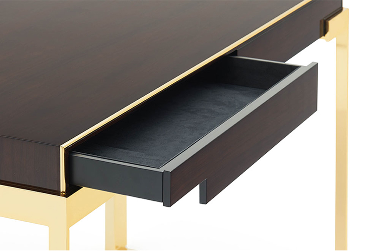 Dark, with glossy brushed finishing. Brass details coordinated with the frame