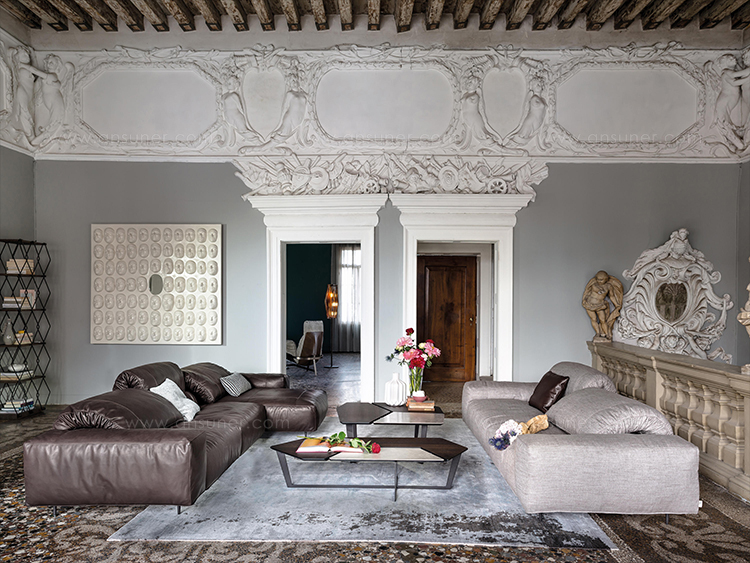 纳尔逊咖啡桌的主要特点是它的桌面。桌面被一个很深的缝隙分开但它们是由结构组成的。将木头和皮革等温暖的材料结合在一起组合成了不规则的几何形状的桌面。托斯卡纳传统的蔬菜鞣革是一种以多种颜色、独特香气和小瑕疵为特点的天然产物。