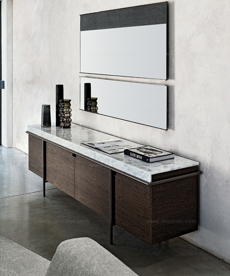 干净而严谨的外形特征是Aura餐具柜的特征。纯粹与几何灵感之间的相互作用是为了创造出一种具有独创性和优雅风格的设计作品。它的顶部是由大理石或蚀刻玻璃制成的,实木柜身漆成灰色或者棕色,由云母棕色、黄铜、钛或氧化灰色的金属管包裹。视觉效果是一个有着丰富而坚定的个性的形象。