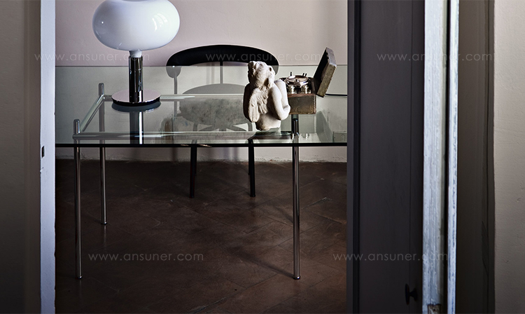 矩形桌,采用CR3三价镀铬钢结构或浅蓝色哑光珐琅钢架。桌面选用50mm厚的胡桃木或15mm厚的晶质或网纹玻璃。有2种尺寸的矩形桌面可供挑选:160x120 cm或120x80 cm,这款于1925年为La Roche House设计的桌子为不同位置带来了解决方案。他们的精髓在于支撑和被支撑两个元素之间的比例对比,也就是说:垂直形状的桌腿的最低宽度以及水平方向桌面的最大宽度。Le Corbusier的其它设计中也强调尺寸关系的对比,确认存在塑料诗意的优点,普遍通过元素角色反演、桌面与实际重量的振动大小以及桌腿与视觉精美的舒适稳定度进行表达。
