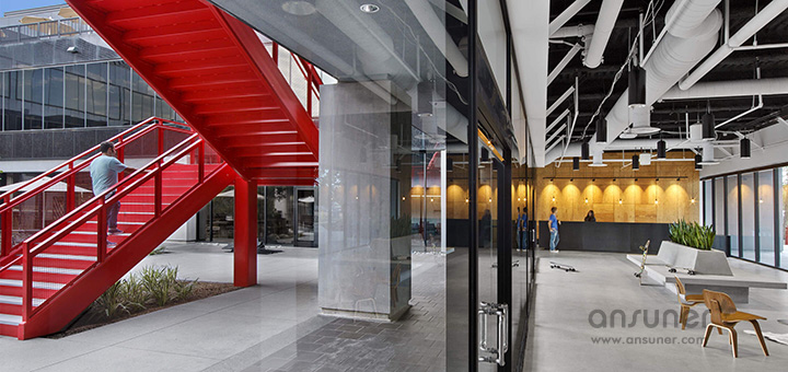 Vans 的全球总部非常炫酷,这里就像是橙县的一小块硅谷,孕育着各种无限的可能。总部占地14英亩,为品牌的发展演绎和未来成长提供了充足的空间。办公建筑围绕一处大型开阔的中央庭院而建,标志性的红色楼梯成为露天庭院最显眼的装饰,连接起每个楼层的咖啡厅,以及三楼的露台烧烤和中央庭院。